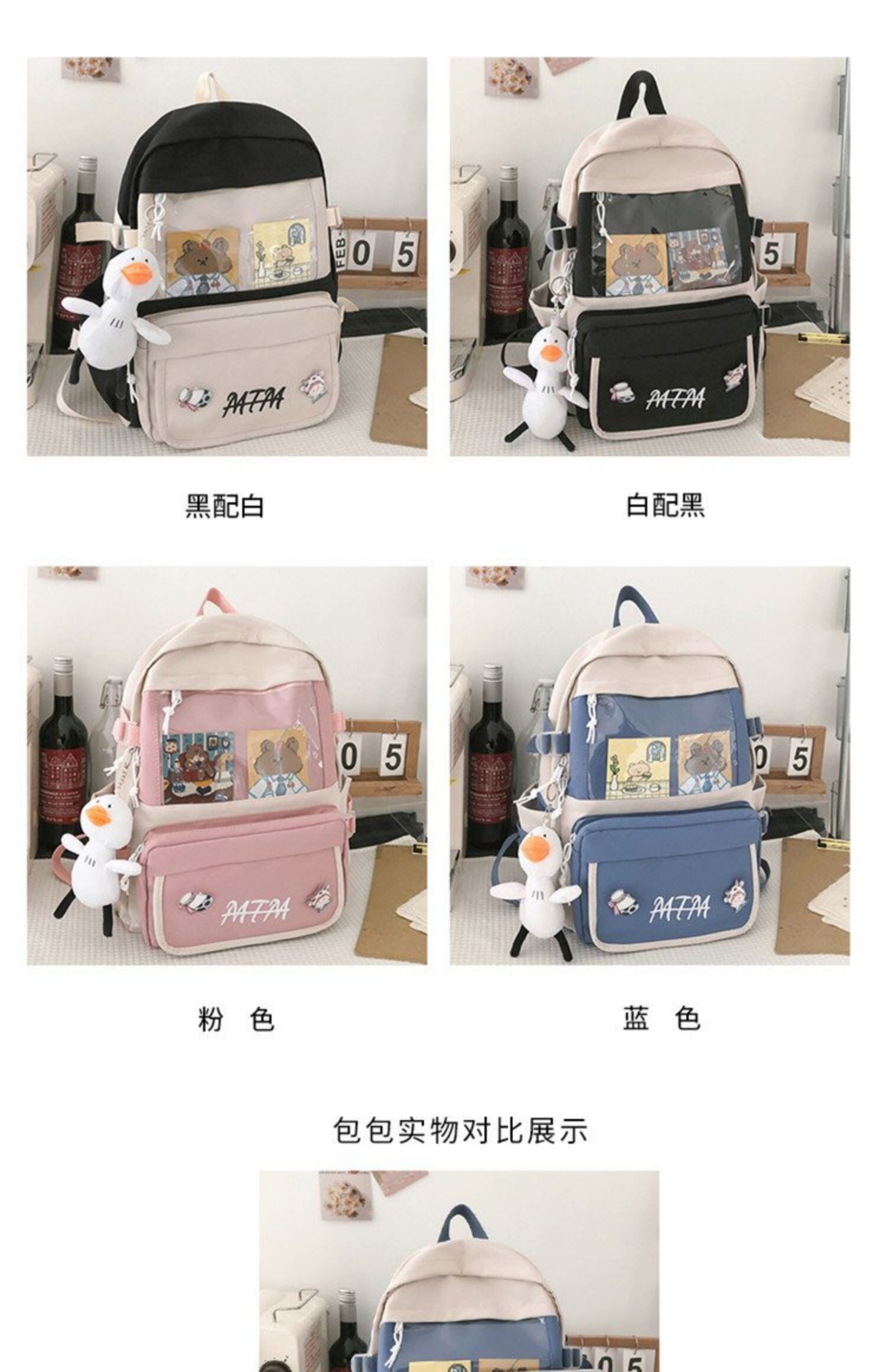 色:黒(カードを送る+メダル+人形のアヒルのペンダント),ブルー(カード送信+メダル+ドールダックペンダント),白(カードを送る+メダル+人形のアヒルのペンダント),ピンク(ペンダントなしシングルバッグ),ピンク(カードを送る+メダル+人形のアヒルのペンダント),ブラック(ペンダントなしシングルバッグ),ホワイト(ペンダントなしシングルバッグ),ブルー(ペンダントなしシングルバッグ),クマ*1